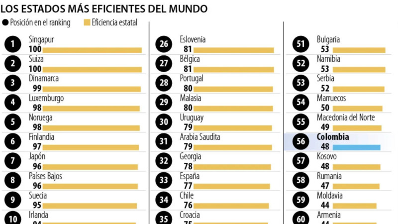 Según datos del Banco Mundial, Colombia se posicionó en el puesto 56 entre los estados más eficientes del mundo, logrando una calificación de 48 sobre 100 en eficiencia estatal. Este resultado lo coloca detrás de varias naciones latinoamericanas líderes en este aspecto.