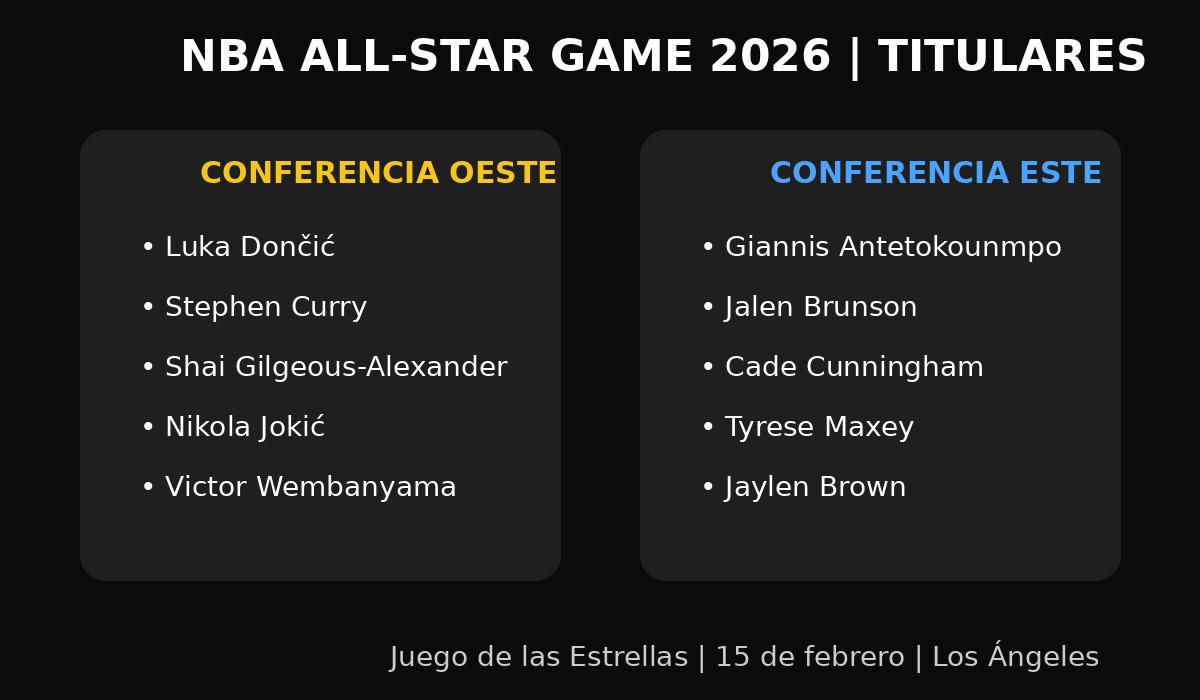 En la Conferencia Oeste, la titularidad quedó en manos de Luka Dončić, Stephen Curry, Shai Gilgeous-Alexander, Nikola Jokić y Victor Wembanyama. El quinteto refleja una mezcla de experiencia, talento internacional y dominio estadístico, con jugadores que han sido determinantes para el rendimiento de sus equipos en la presente campaña.